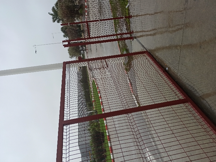 The image displays an outdoor scene in Gueznaïa, Morocco, under an overcast sky with wet surfaces indicating recent precipitation. In the foreground, a reddish-brown metal wire mesh gate is partially open. The left panel is angled towards the viewer, while the right panel is open, positioned parallel to the adjacent asphalt road. The ground immediately below the gate consists of wet concrete, reflecting light. Beyond the gate, an asphalt road is visible, bordered by distinct red and white striped curbs. Behind the curb, a strip of green grass and low-lying bushes extends. In the midground, several large structures, possibly industrial or commercial buildings, with dark roofs are partially visible behind the vegetation. The background features a uniformly gray, overcast sky. A tall, light-colored pole, potentially a flagpole or communication tower, stands prominently on the left side of the frame. Further to the right, a street light pole is visible. Distant trees with some foliage are also present. No individuals are depicted in the scene.