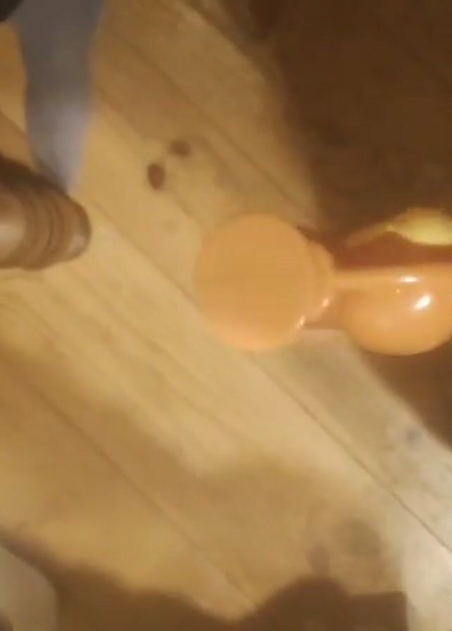 person holding an orange, plastic toy. The toy is made up of multiple spheres of different sizes, connected together. The toy is being held over a wooden floor. Next to the toy is a round, wooden table with a decorative edge. The person is wearing black pants and a gray sock.