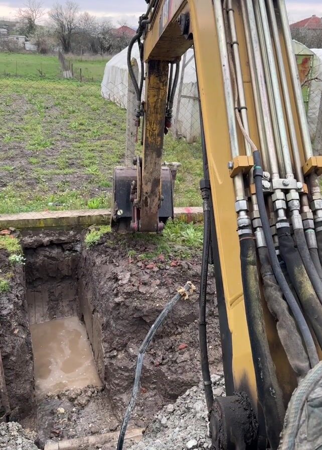 yellow CAT excavator digging a rectangular hole in the ground. The hole is filled with muddy water. A black hose lies near the edge of the hole. The excavator's arm and bucket are positioned above the hole. In the background, there is a green lawn, a greenhouse, and some houses. The sky is overcast. The camera appears to be positioned inside the excavator cab.