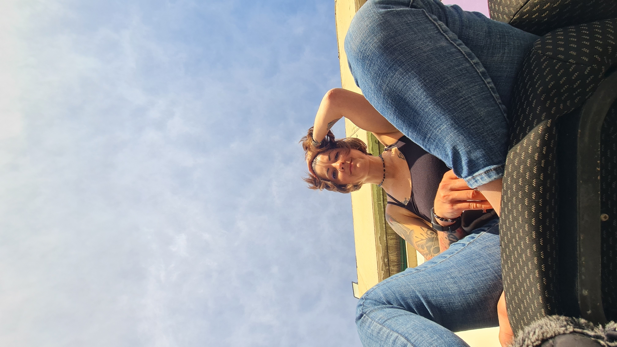 In Rishon LeZion, Israel, an adult female subject is depicted from a low-angle perspective looking upwards. She has short, brown, wavy hair and is wearing a black tank top and blue denim jeans. Multiple dark-colored tattoos are visible on both upper extremities. A dark beaded necklace is worn around her neck, and a dark wristband is present on her left wrist. Her right hand is raised, with fingers partially obscuring the right side of her head. The subject maintains a direct gaze towards the camera with a slight smile. In the immediate foreground, a dark, patterned object, consistent with seating, is visible. Behind the subject, a light yellow building facade stretches horizontally across the mid-background. The upper background consists of a clear blue sky with scattered white clouds, indicating natural daylight illumination.