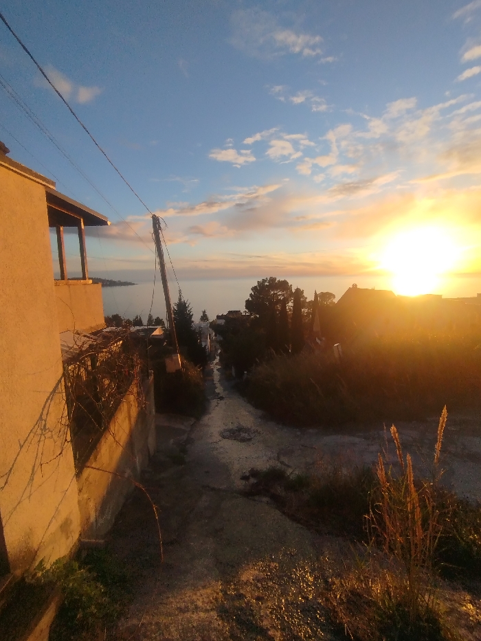 A sunlit outdoor scene displays a narrow road winding downhill. A building with a balcony stands to the left, partially lit by the sun. Vegetation grows along the roadside, with taller grasses visible in the foreground. In the distance, the sun shines brightly above the horizon, creating a warm glow over the sea and the clouds. A power line is visible against the sky.