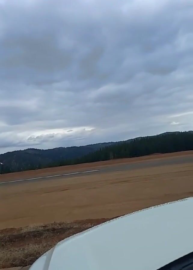 The video depicts an outdoor scene on a cloudy day. The foreground shows a white vehicle, with the viewer positioned inside. Beyond the vehicle, there is a long, wide, flat expanse of brown land that appears to be a runway. In the distance, a line of dark green trees stretches across the horizon, against a backdrop of rolling hills. Above, the sky is filled with thick, grey clouds, indicating overcast conditions. A windsock is visible on the left, its red and white stripes indicating wind direction.