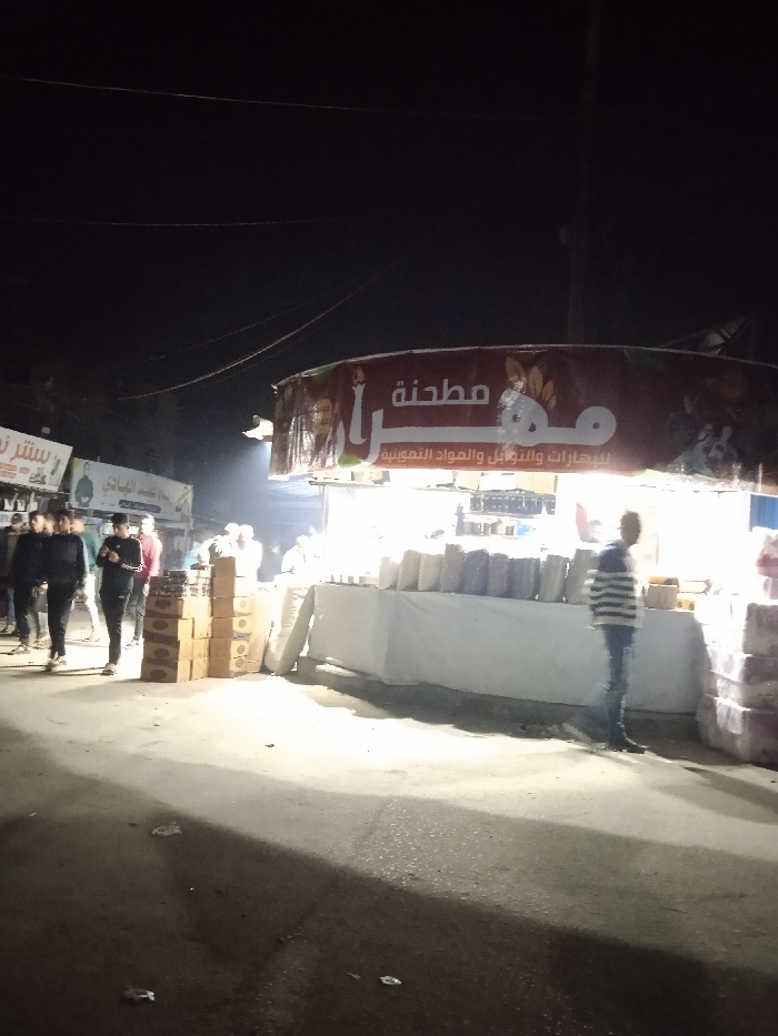 - "A nighttime street scene features a brightly lit vendor stall with a sign in Arabic" by FM-taMrd2, licensed under CC BY 4.0
