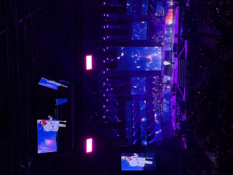 The image depicts a live music concert held within a large indoor arena, specifically Arena Sofia (formerly Armeets Arena) in Sofia, Bulgaria. The central focus is a multi-tiered stage illuminated predominantly with purple and blue lighting. On the main stage, a male vocalist, dressed in a white shirt and dark trousers, stands centrally, holding a microphone and performing. Behind him, on elevated sections of the stage, an orchestra or band consisting of approximately fifteen to twenty musicians is positioned with their instruments, including drums, string instruments, and keyboards. The stage backdrop incorporates an extensive array of LED screens. A prominent tall vertical screen is centrally located, flanked by multiple horizontal and vertical screens displaying abstract blue and purple visuals. Two additional large rectangular LED screens are suspended above the stage, both displaying a close-up live feed of the main vocalist. The performance area is further illuminated by numerous spotlights and overhead rectangular magenta lighting fixtures. In the foreground, a large audience is seated in rows, facing the stage, with portions of the crowd visible from an elevated perspective. The overall environment is dark, with light emanating primarily from the stage production.