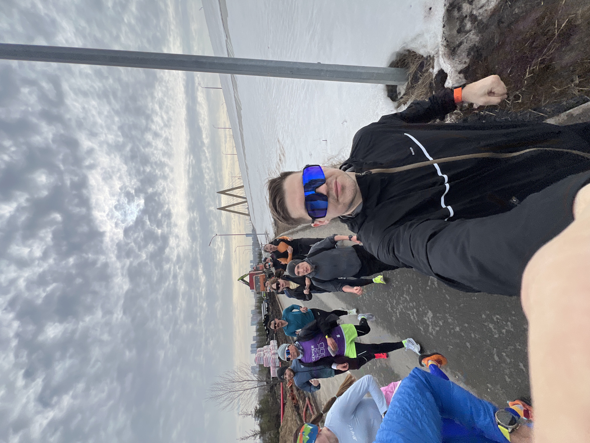 A group of people, likely runners, pose for a selfie on a paved road next to a snowy area