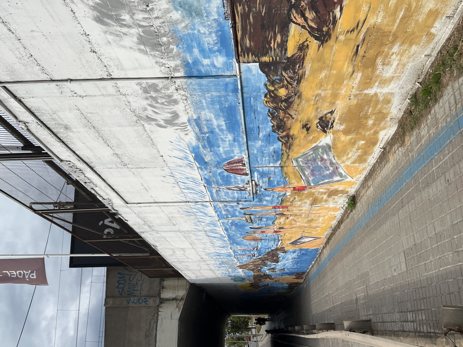 - "An outdoor scene in Vilanova i la Geltrú, Spain, depicts a long concrete retaining wall with a colorful mural along a pedestrian walkway leading into an underpass" by FM-K76IW2, licensed under CC BY 4.0