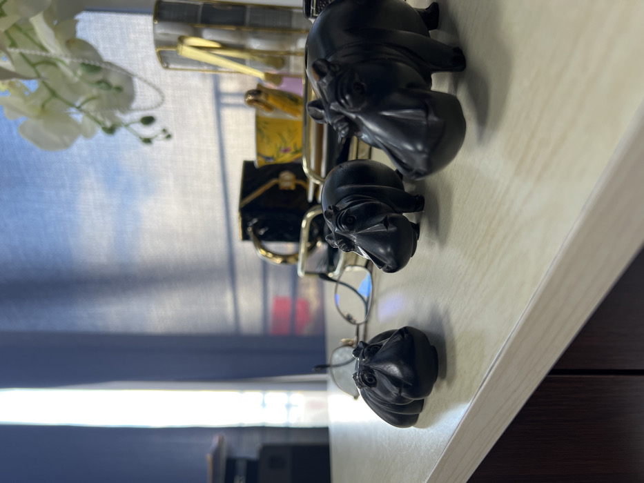 The scene is set indoors within a room in Meknes, Morocco, featuring a light-colored, wood-grain desk surface viewed from a low angle. In the foreground, three dark, possibly carved, hippopotamus figurines are displayed. The leftmost figurine is smaller and appears in a recumbent position. To its immediate right, a pair of gold-rimmed eyeglasses with clear lenses rests on the desk. Further right, two larger, standing hippopotamus figurines are positioned, one partially out of focus in the extreme foreground. Behind these objects, a gold-colored tray holds a black mug with a gold handle and design, and a smaller yellow cup with a decorative pattern. A tall, patterned vase, containing artificial white flowers (resembling orchids) and a thin silver decorative chain, is visible behind the cups. The background consists of a large window covered by light blue or grey-blue translucent roller blinds or curtains, allowing bright natural light to enter and creating a backlit effect. Shadows, possibly from external architectural elements, are cast upon the curtains. The lower left quadrant reveals a dark brown cabinet or desk unit beneath the main surface. No individuals are present.