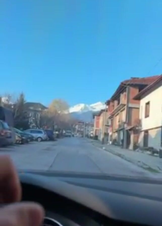 view from inside a car driving down a residential street on a sunny day. On both sides of the street are two-story buildings. Cars are parked on the left side of the street. At the end of the street, a snow-capped mountain is visible against the clear blue sky. A hand taps a part of the dashboard.