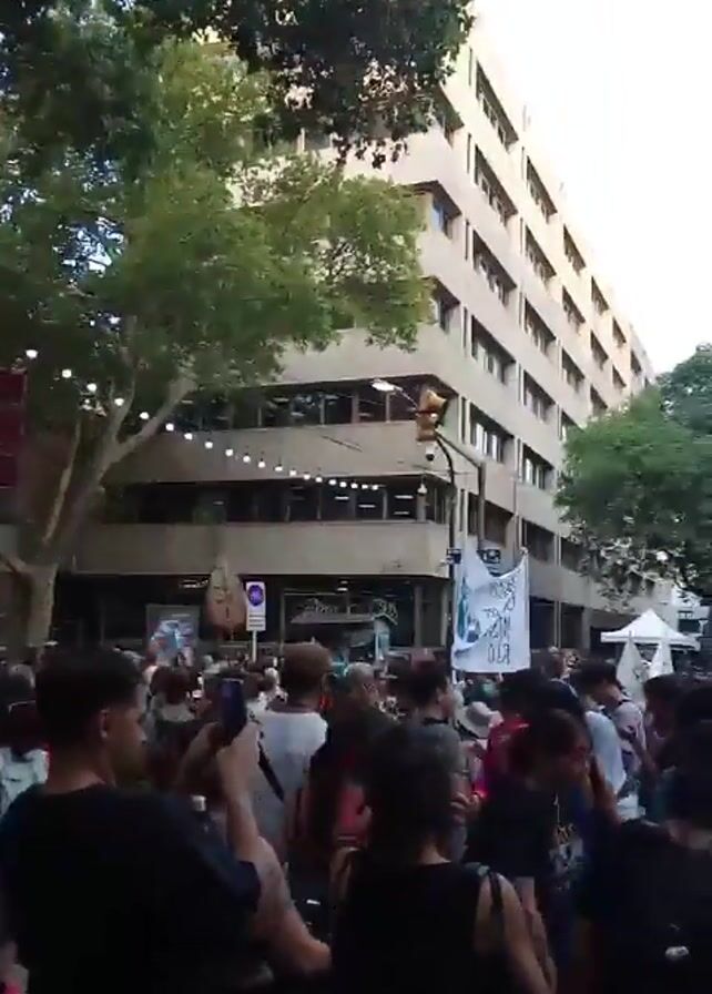 A large crowd of people is gathered on a street. Many people are holding signs and flags. There are tall buildings on either side of the street, and trees are visible in the background. The sky is partly cloudy. A music rhythm is audible. The overall mood is lively and possibly celebratory.