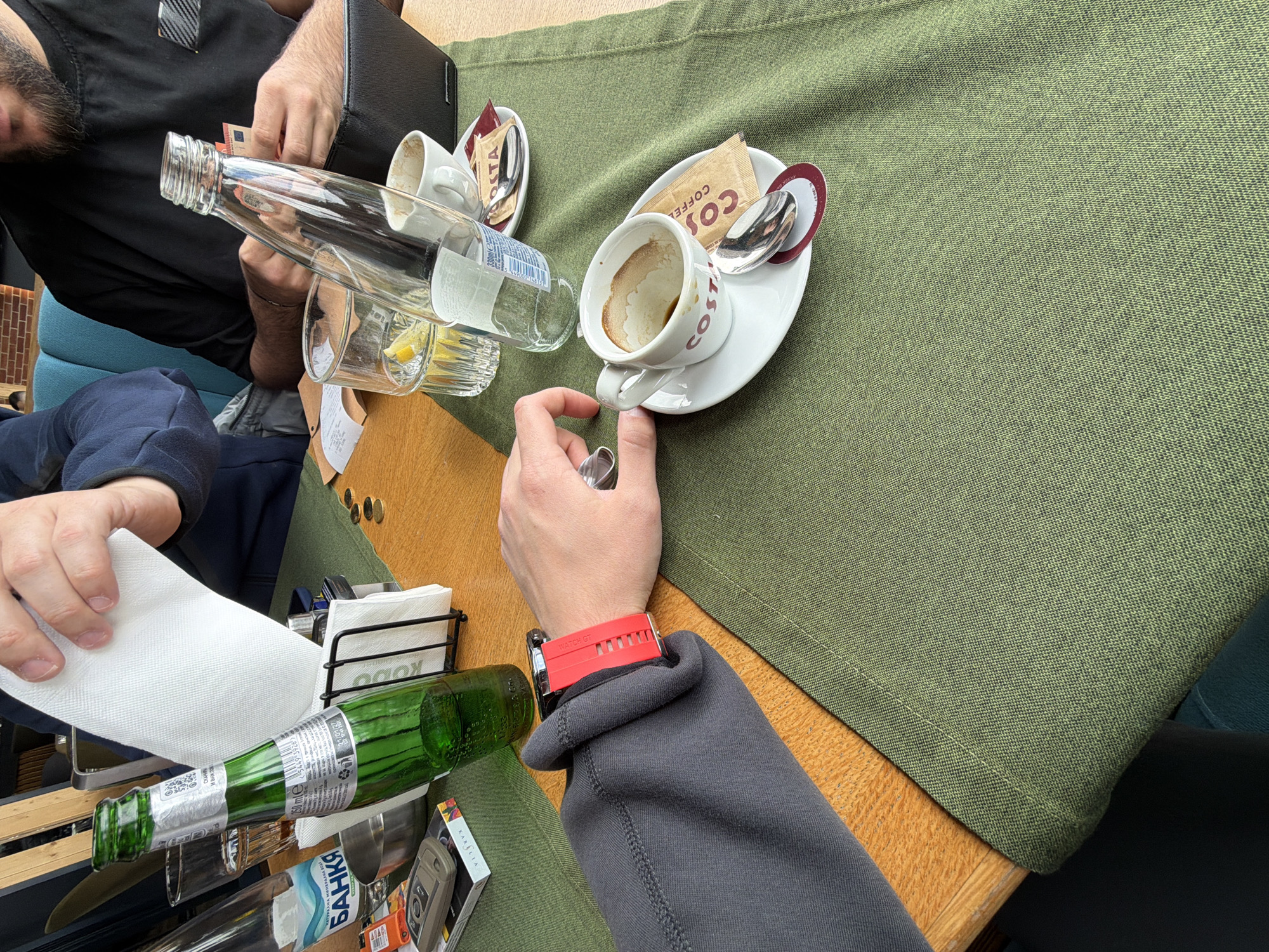The image depicts an indoor café or restaurant scene in Radilovo, Bulgaria, viewed from a close perspective above a table. The main surface is a light-colored wooden table partially covered by an olive-green fabric tablecloth or runner. Three individuals are partially visible. In the foreground-left, a person's left forearm, encased in a dark gray long-sleeved garment, wears a black smartwatch with a bright red silicone strap. This hand is positioned near an empty white ceramic Costa Coffee cup, resting on its saucer with coffee residue inside, alongside a silver spoon and a brown "COSTA COFFEE" sugar packet. Adjacent to this, a clear glass contains ice and a lemon slice, and an empty clear glass bottle (330ml capacity) stands upright. Further to the left, an empty 250ml green glass bottle with Bulgarian labeling, a small clear plastic bottle of "БАНКА" (BANKA) brand mineral water, a gray key fob, and a pack of "KARAKIA" cigarettes are visible. A black wire napkin holder filled with white paper napkins is also on the table. Several small coins are scattered on the exposed wooden table surface. In the upper-center of the frame, the hands of a second person are shown holding a white paper napkin. To the right, a third individual, wearing a black t-shirt and possessing a beard, is visible handling Euro banknotes from a black wallet or organizer. Near this person, another empty white ceramic Costa Coffee cup and saucer, with a spoon and a sugar packet, are present. A paper receipt is also visible on the table. The background shows a light blue upholstered booth seat and a section of a reddish-brown patterned wall.