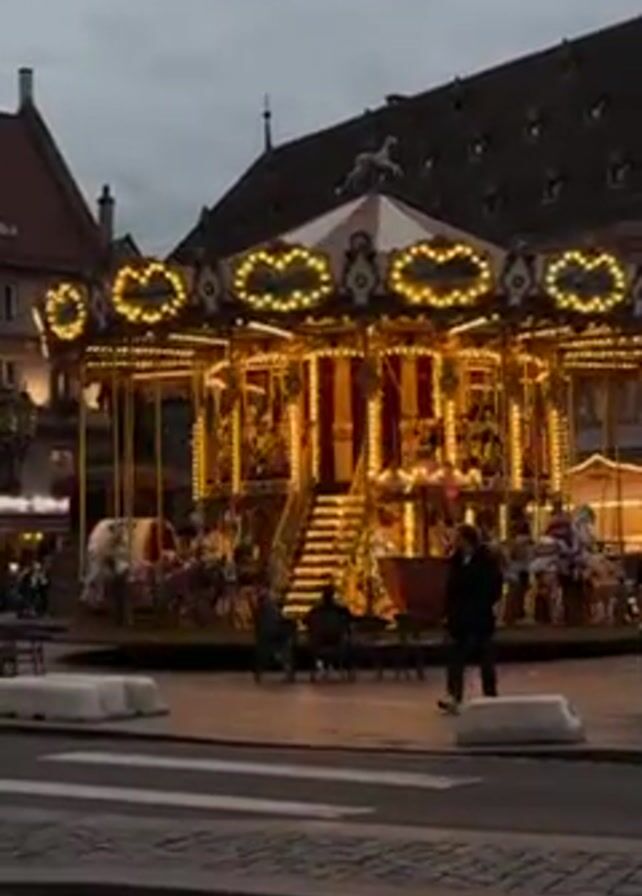carousel in a town square at dusk. The carousel is brightly lit with yellow lights and features horses. A person walks across a crosswalk in front of the carousel. Other people are seated near the carousel. Buildings with traditional architecture are visible in the background. The sky is overcast.