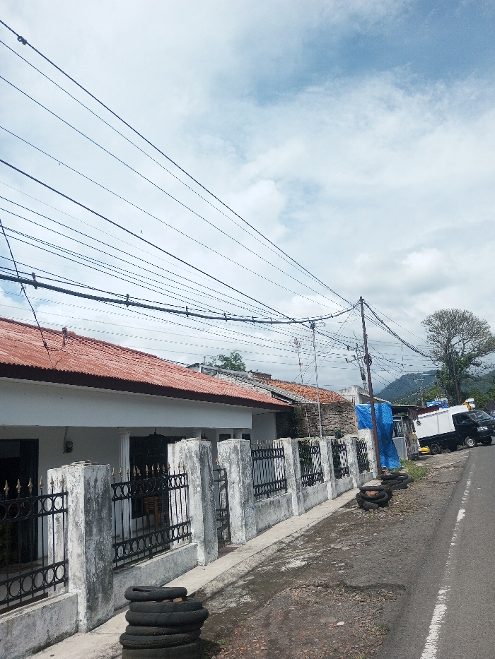 A single-story building with a red roof and white exterior sits behind a weathered concrete fence with black iron bars. Power lines crisscross the sky above. A small truck is parked on the side of the road. Stacks of tires are visible near the fence. A mountain range appears faintly in the distance under a cloudy sky.