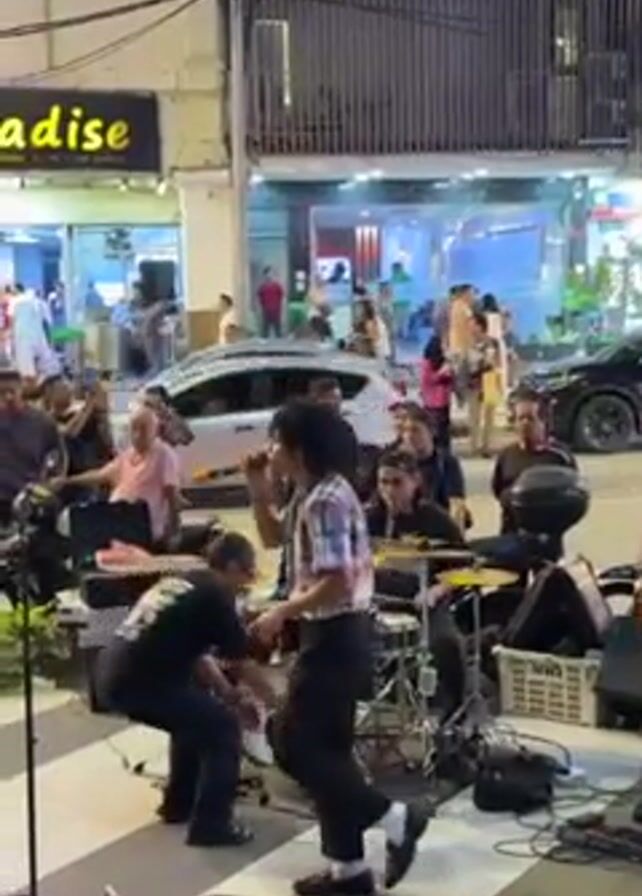 A rock band performs in front of a restaurant called "Paradise" on a city street at night. The band consists of a singer with dark hair wearing a plaid shirt and black pants, a drummer behind him, a guitarist to the right, and what appears to be a keyboardist or other musician to the left. The singer holds a microphone and performs enthusiastically. Passersby and onlookers gather around to watch, some clapping and recording with their phones. The street is lit with overhead string lights and neon signs. Cars and scooters drive by in the background. The scene suggests a lively street performance.