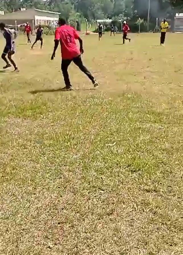 A video shows a group of young men playing soccer on a grass field. They are wearing red and black uniforms. One man wearing a red shirt dribbles the ball as others run to make or defend a play. A person’s arm is briefly in the foreground. The setting appears to be a rural area with trees and buildings in the background. The weather seems to be sunny and clear.
