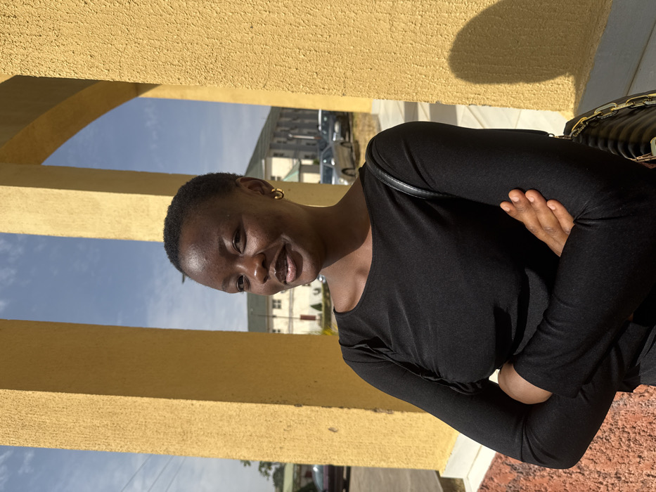 A young woman with dark skin and short dark hair, wearing a black long-sleeved boat-neck top and small gold-colored hoop earrings, is depicted standing outdoors. She is positioned slightly to the left of the frame, with her head turned slightly to her right, a subtle smile on her face, looking towards the camera. Her arms are crossed over her chest. A black shoulder bag with a gold chain strap is visible over her right shoulder. She is illuminated by strong sunlight originating from the right, casting a shadow from her head onto her right shoulder and chest. The immediate background consists of two prominent, textured yellow pillars; the one on the right is closer and partially frames her. Behind the pillars, under a clear blue sky with sparse clouds, a multi-story, light-colored building with a dark roof is visible in the mid-distance. Several parked vehicles, including silver and dark-colored sedans, are present on a paved area beyond the building. Distant green foliage is also visible. The specific location within the city of Jos, Nigeria, cannot be determined from the provided visual information.