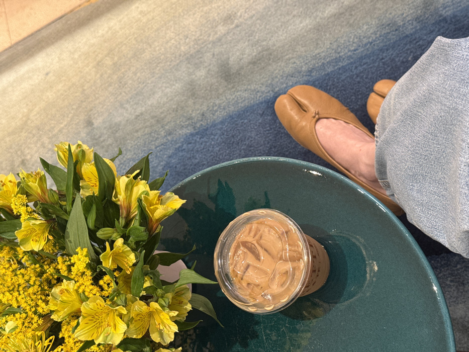 This image captures a high-angle view of a tabletop arrangement and a person's lower extremities, situated in Zapopan, Mexico. A round, teal-colored table occupies the left and central foreground. On this table, a clear plastic cup with a transparent lid holds a brown, iced beverage containing visible ice cubes. To the upper left of the table, a bouquet of yellow flowers, predominantly Alstroemeria and smaller clustered florets, is displayed in a partially visible white vase. The lower right portion of the frame shows a person's left leg, clad in light blue denim jeans. Their foot is encased in a tan leather split-toe flat shoe. The background consists of a carpeted floor featuring a blue gradient pattern, transitioning from lighter to darker shades of blue.