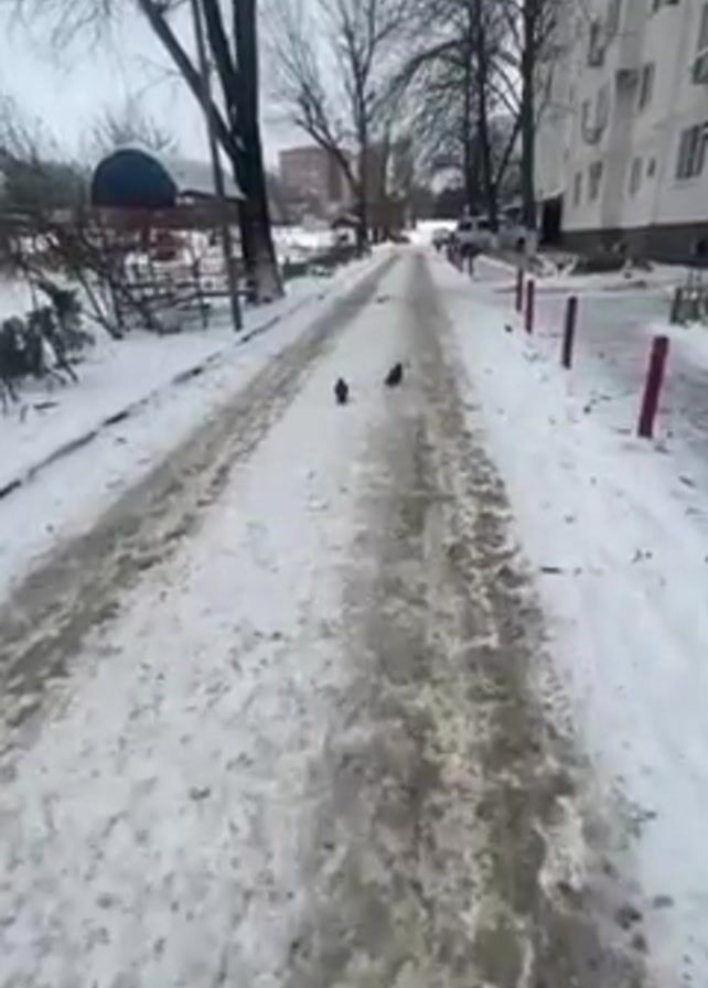 snowy path in an urban area. The path is slushy with patches of ice. On either side of the path is snow-covered ground. Two pigeons are standing on the path. As the video progresses, a third pigeon comes into view. The camera moves forward along the path, and one of the pigeons flies away as the person with the camera approaches. Trees and buildings are visible in the background. The person filming is wearing black shoes.