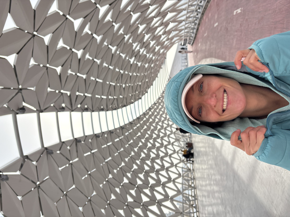 A woman, appearing in her 30s-40s with blue eyes and a broad smile, faces the camera directly. She wears a teal/aqua hooded puffer jacket with the hood pulled up, partially obscuring a light pink baseball cap worn underneath. Her hands are positioned at the front edges of her jacket's hood. The subject is positioned in the foreground of an enclosed pedestrian bridge, identified as the Atyrau Bridge (also known as the Fish Bridge) in Astana, Kazakhstan. The bridge features a distinctive architectural design with a vaulted ceiling and walls composed of light-colored, geometrically tessellated panels, forming a repeating pattern resembling fish scales or rhombi. A continuous, bright skylight runs along the center of the ceiling, illuminating the interior. The bridge's floor is divided into two distinct pathways: a light-colored, smooth surface on the left and a reddish-pink pathway on the right, separated by metal railings. In the mid-ground on the left pathway, a small group of indistinct figures is visible, one appearing to be seated. Further down the right pathway, two additional indistinct figures are seen walking away from the camera. The background extends into the distance, revealing the curved interior of the bridge.