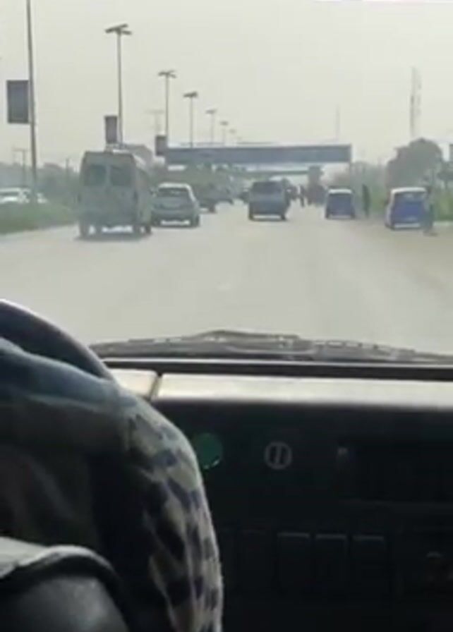 A view from the inside of a vehicle shows a road with multiple cars