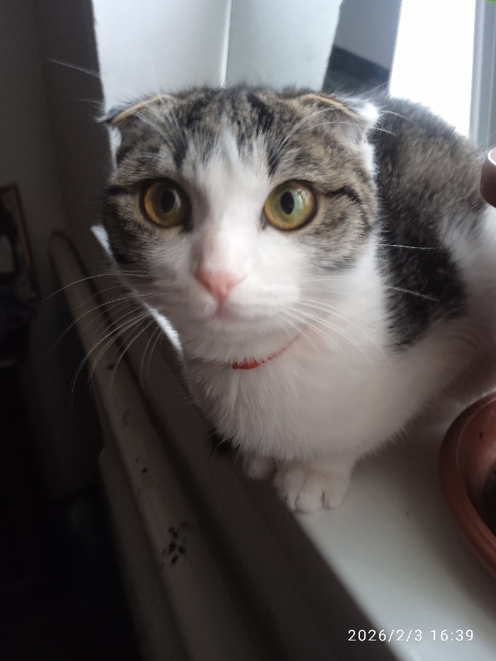 An image captured in the city of Khujayli, Uzbekistan, on 2026/2/3 at 16:39, depicts a domestic cat positioned centrally. The feline exhibits a white and grey/dark tabby fur pattern, characteristic folded ears consistent with a Scottish Fold breed, and large yellowish-green eyes. A thin red collar is visible around its neck. The cat is seated on a white surface, likely a window sill or ledge, and is oriented directly towards the viewer. The background to the left is dark and out of focus, suggesting an indoor environment with natural light from a window source. A partial view of a small, dark brown pot is visible on the right side of the frame, adjacent to the cat.