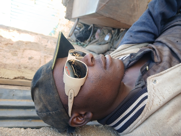 An adult male with dark skin is depicted in a right-facing profile, leaning against a rough, light-colored wall. He wears a dark, worn baseball cap with a green underside to the brim. Beige safety glasses with dark lenses obscure his eyes; the right temple arm displays the word "Safety," and the left lens reflects two dark, circular objects. His attire consists of a striped, collared inner shirt, partially visible and appearing soiled, beneath a light-colored jacket with a ribbed, dark-colored collar featuring two white horizontal stripes. The jacket has visible metal snaps and a dark blue/grey section on its left sleeve. In the background, a vertically corrugated metal sheet is present to the left, and further indistinct structures with dark, ambiguous shapes are visible. The scene is located in Unguwar Saya, Nigeria.