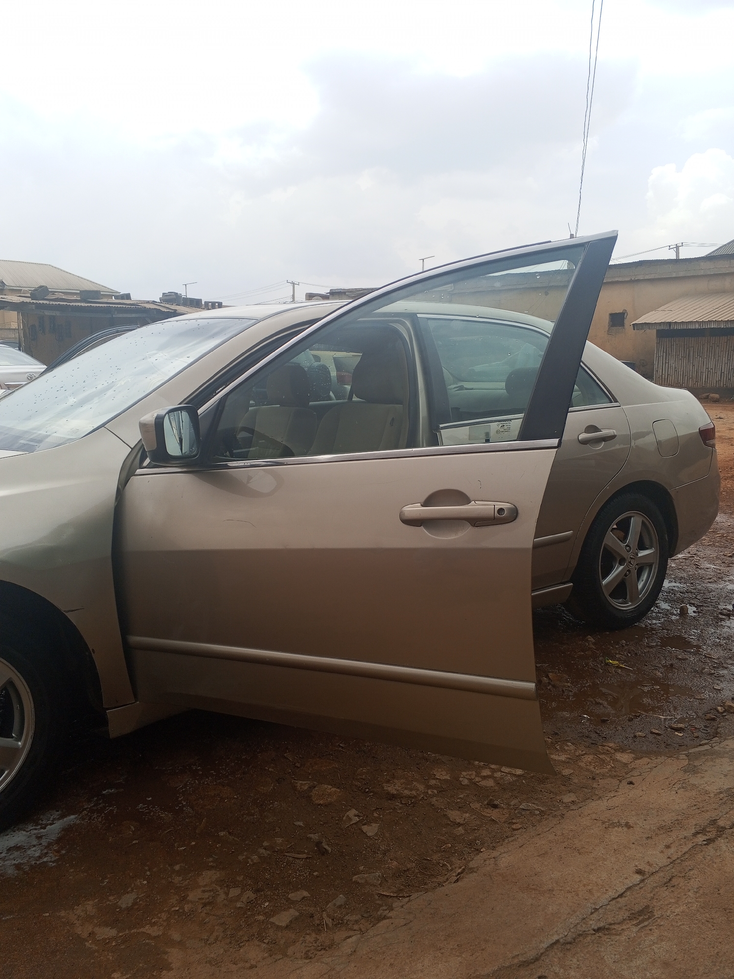 A gold-colored four-door sedan, possibly a Honda Accord, is parked on a wet, reddish-brown dirt surface in Gura Top, Nigeria