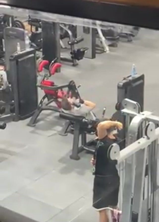 gym with several people exercising. One person is doing crunches on a machine with red padding. Another individual is standing at a cable machine, lifting the weight with their right arm. They are wearing a black shirt and shorts. Various weight machines are visible throughout the gym. The video is taken from an elevated perspective.