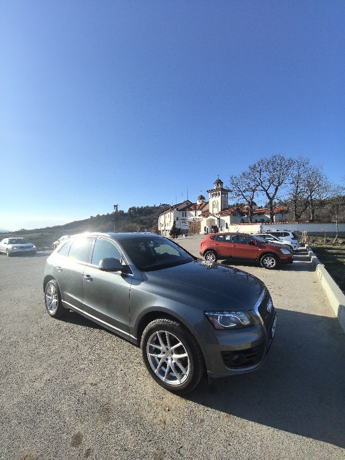 The scene depicts a parking area in Klisura, Bulgaria, with the Klisura Monastery complex visible in the background. In the immediate foreground, a dark grey Audi Q5 SUV is parked, angled slightly left, its polished multi-spoke wheels reflecting sunlight. Further back, an orange compact SUV and a white SUV are parked in designated spaces on a paved section. The Klisura Monastery, a prominent multi-story white building with red-tiled roofs, multiple domes topped with crosses, and a central bell tower, occupies the mid-to-background. Bare deciduous trees are situated near the monastery and on the surrounding hills. The sky is clear blue. The ground consists of a light-colored gravel and paved surface, with shadows cast by the vehicles indicating direct sunlight. No individuals are present.