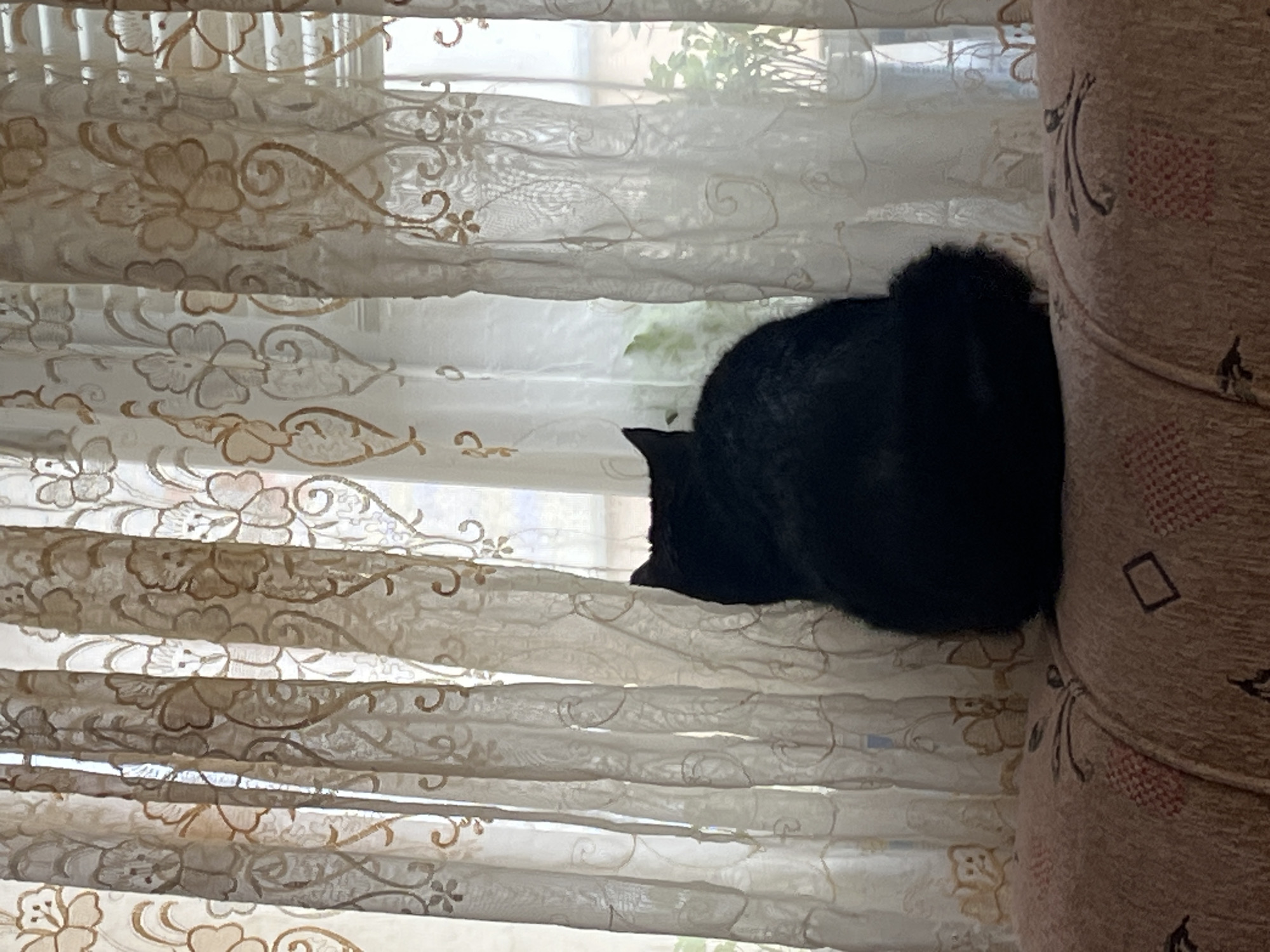 A black cat is resting on a patterned sofa next to a window covered with white lace curtains. Outside the window, green foliage is visible. The image appears to have been taken indoors. The location is not discernible as Vratsa, Bulgaria based on the visible details.
