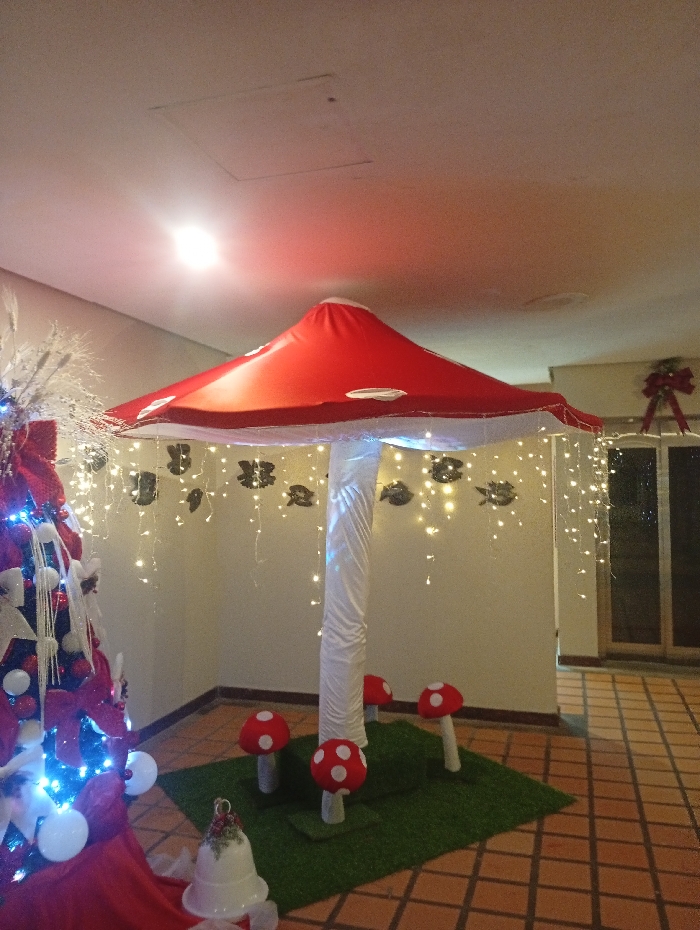 A fanciful indoor display features a large, red-capped mushroom with white spots and a draped white trunk, illuminated by string lights. Below, smaller red-and-white mushrooms sprout from a square of artificial turf. Nearby, a decorated Christmas tree with blue lights and red accents adds to the festive atmosphere. The setting is a room with tiled floors and neutral-colored walls.