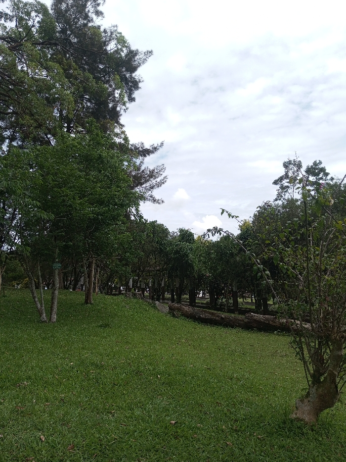 A grassy park slopes upward towards a treeline under a cloudy sky. Several trees with light-colored trunks stand on the left, leading to a row of darker green trees in the background. A fallen log lies near the edge of the grassy area. On the right, a bush with sparse foliage and a thick trunk sits near the foreground. A tall, dark tree with dense foliage looms over the left side of the scene.