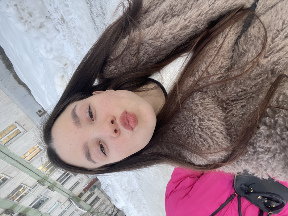 An outdoor, slightly angled selfie depicts a young female in Chaikovsky, Russia, during winter