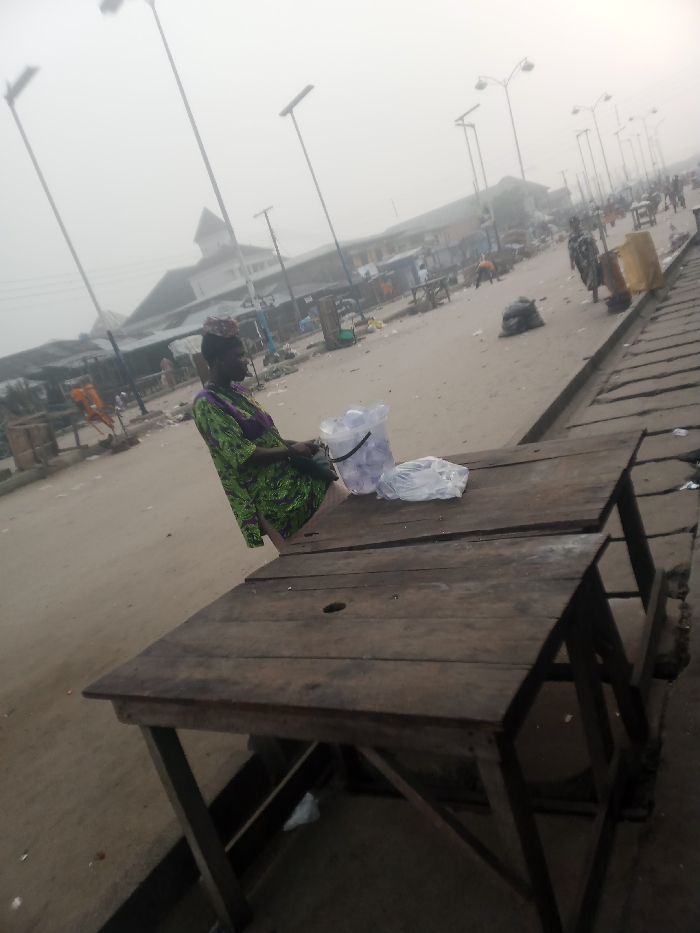 A street scene is veiled in mist. At the forefront, two weathered wooden tables stand, one slightly above the other. An older woman in vibrant green and purple garb sits at the edge of the higher table with plastic containers nearby. Beyond, a bustling marketplace unfolds with several structures and passersby. Street lights line the road. The general atmosphere is dense with fog and a sense of activity.