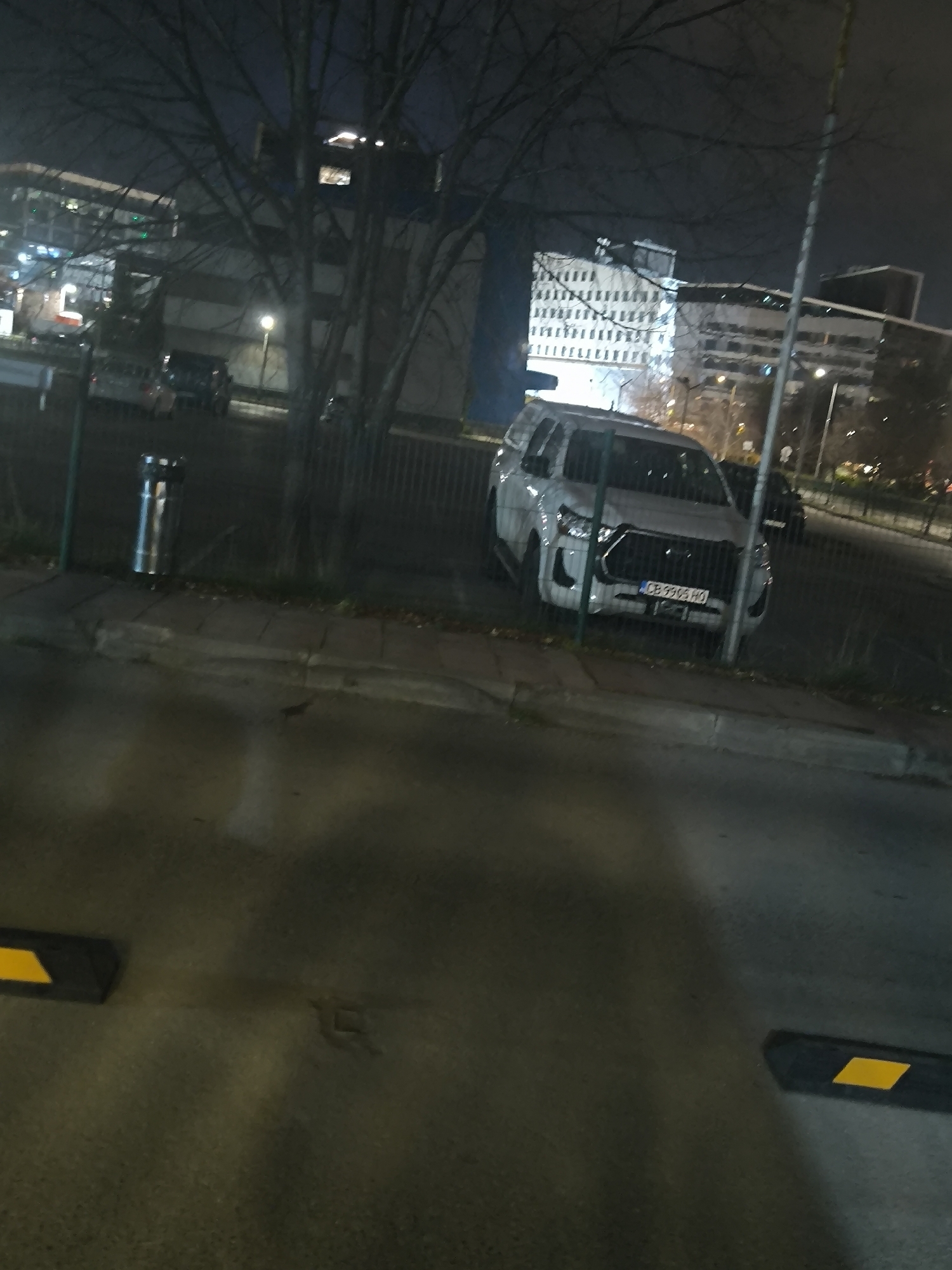 The image depicts a nighttime urban scene in Sofia, Bulgaria, specifically in the vicinity of the National Palace of Culture (NDK). The scene is illuminated by artificial light sources. In the mid-ground, a white SUV is parked behind a dark metal fence. The vehicle displays a Bulgarian license plate, "CB 9905 HO," indicating its registration in Sofia. Behind the SUV, several multi-story buildings are visible. One prominent building is brightly lit with numerous windows, while another features a noticeable blue-colored facade or wall. Bare trees, indicating a dormant season, are scattered across the background and mid-ground. A tall, slender pole stands vertically near the center-right of the frame. In the left foreground, a silver cylindrical trash receptacle is positioned near the fence. A concrete sidewalk curb runs parallel to the fence. The immediate foreground consists of an asphalt surface with two black parking stops, each featuring a yellow reflective strip. No individuals are visible within the frame.