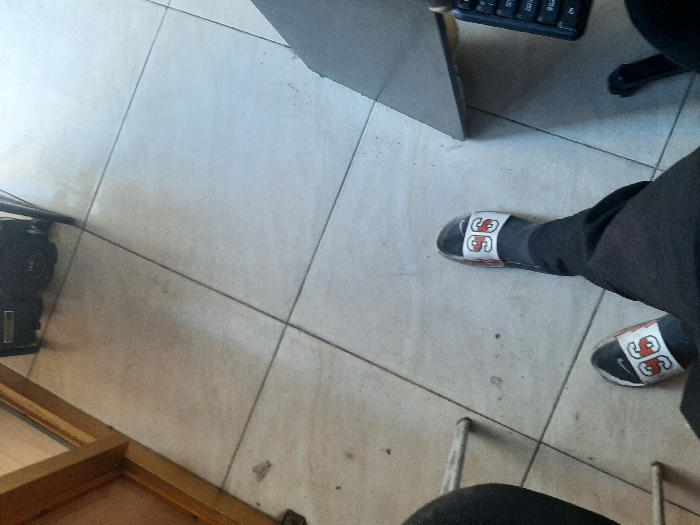 The image displays an overhead view of an interior tiled floor in Al-Qadam Municipality, Syria. The floor consists of light-colored square tiles with dark grout lines, exhibiting minor scuff marks and dirt. A person's lower body is central to the frame, wearing dark trousers and dark socks. On their feet are black slide sandals, each featuring a white strap with a red "96" numeral and a white Nike swoosh logo. In the upper left quadrant, a portion of a wooden frame is visible, adjacent to a dark, rectangular machine or generator-like object resting on the floor. To the left of the person, a silver tubular leg, likely from a chair, extends downwards. On the right side of the frame, a dark, vertical surface, consistent with the side of a desk or cabinet, is present. A black computer keyboard is partially visible near this surface, and a black caster wheel, presumably from an office chair, is on the floor further to the right.
