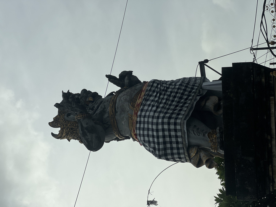 A low-angle shot captures a Balinese statue against an overcast sky. The statue, adorned with a black and white checkered cloth, features intricate carvings around its head. Wires crisscross the upper frame. The right side of the statue is partially obscured by a dark, vertical structure, possibly a wall or pillar. The image conveys a sense of cultural detail and an overcast atmosphere.