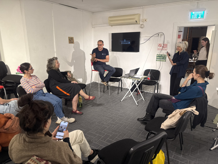 A group of people are gathered in a room, seemingly for a presentation. A man is sitting on a red chair speaking, while a woman stands next to him with a remote in her hand. A laptop sits on a folding table. A TV screen is mounted on the wall behind them. The audience is seated in chairs, some looking at the speakers, one looking at her phone. A "no smoking" sign and an emergency exit sign are visible. The room has a simple, somewhat informal setting.