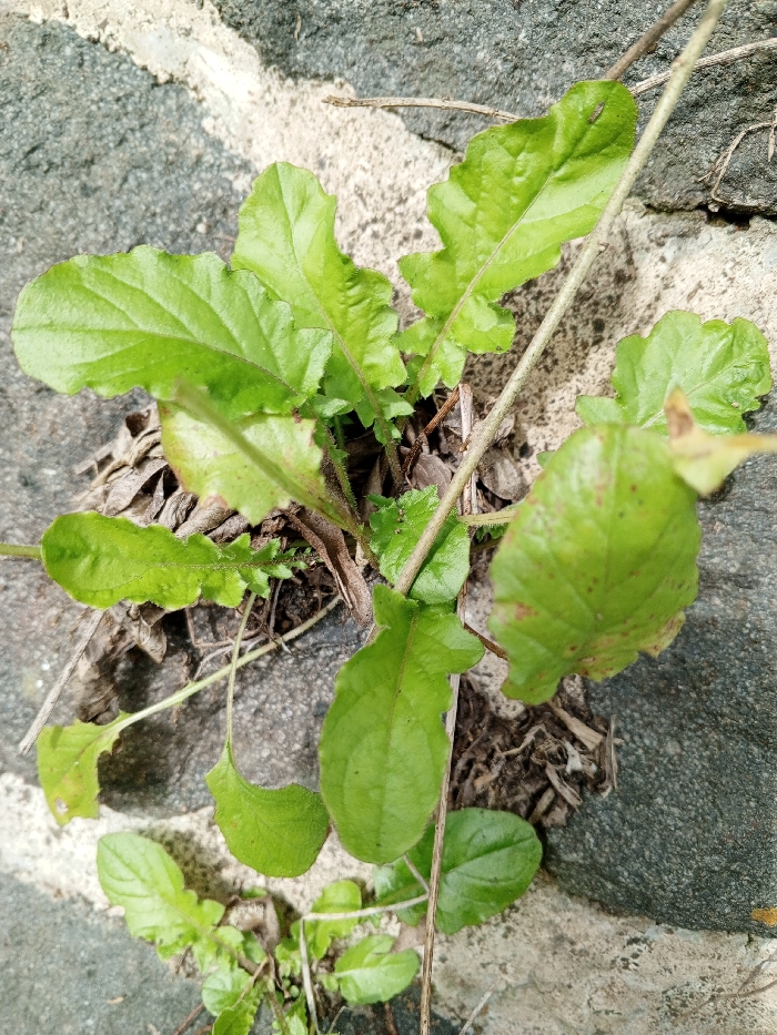 A close-up shows a green plant growing out of a crack between stones. The plant features lobed leaves with uneven, serrated edges, suggesting a member of the Asteraceae family. A thin, woody stem is visible among the leaves. The surrounding area includes decomposing organic matter like dried leaves and twigs. The stone backdrop is gray and textured.