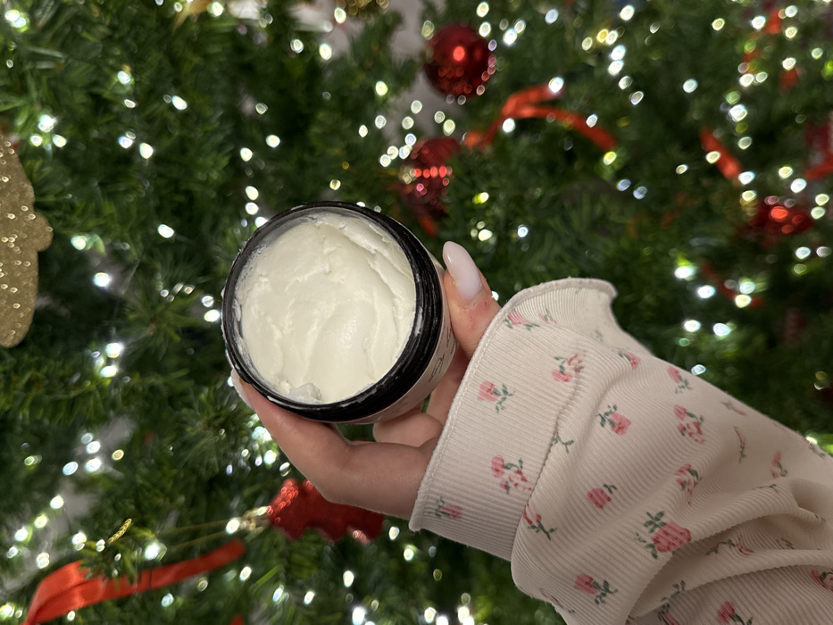 A hand holds a jar of white cream in front of a blurred Christmas tree. The jar has a black lid, and the cream appears smooth and thick. The hand's nails are long and painted a light color. The person wears a light-colored shirt with a floral pattern and ruffled edge. The tree is adorned with lights and red ornaments, creating a festive backdrop.