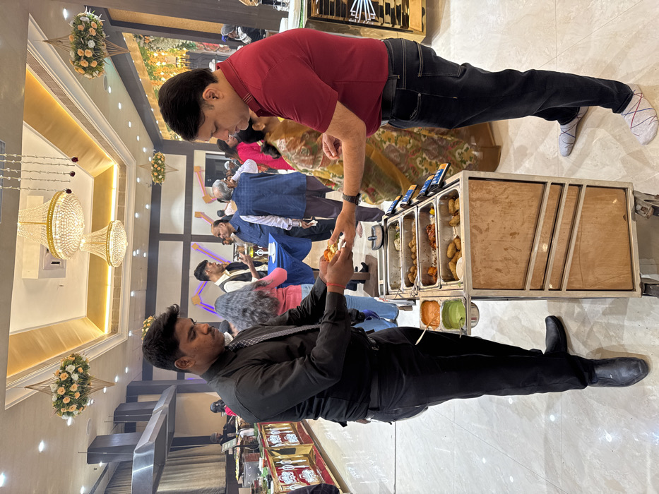 Inside a well-lit banquet hall, a man in a maroon shirt and dark jeans receives a snack from a server in a black uniform. A buffet cart with various food containers and sauces stands between them. Other guests are milling about in the background. The hall features ornate chandeliers, floral decorations, and a decorated ceiling. The floor appears to be polished tile.