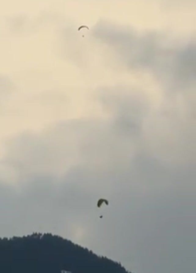 - "cityscape with paragliders in the sky, transitioning to a view of birds flying over a town with a snow-capped mountain in the background" by FM-mnNz92, licensed under CC BY 4.0