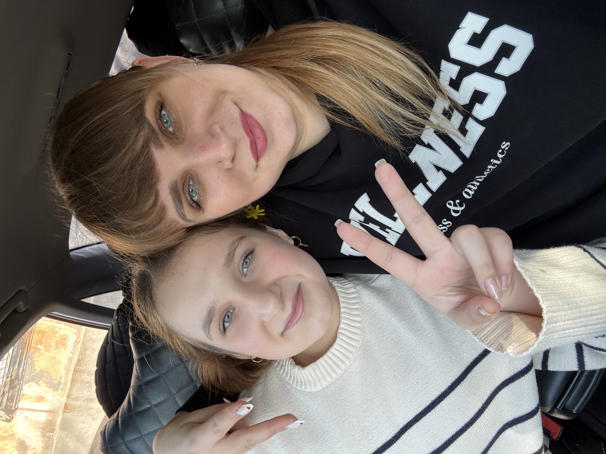 Two females are depicted in a selfie taken inside a vehicle in Makiivka, Ukraine. The younger individual on the left has light brown hair and blue eyes, wearing a cream-colored sweater with dark horizontal stripes. Her left arm is draped behind the adult female, and her right hand forms a peace sign, displaying white nail polish with small red heart designs on some fingers, and a small bandage on the knuckle of the middle finger. The adult female on the right has light brown hair with bangs and blue eyes, wearing a black hooded sweatshirt with white text "WELLNESS ss & athletics." She has a stud piercing on her left nostril and a yellow flower accessory near her left ear. Both subjects are smiling and looking directly at the camera. The vehicle interior features black quilted upholstery on the seats and a partially visible red seatbelt buckle. Through the window in the upper left background, an out-of-focus, orange-toned building structure is visible under natural light.