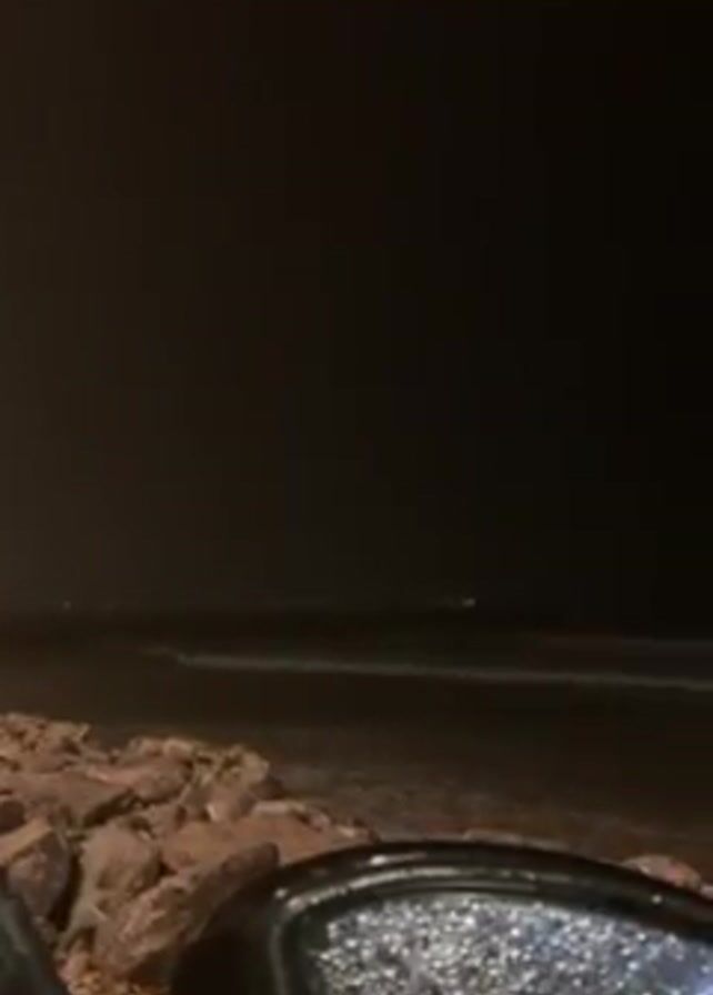 dark coastal scene at night. Waves are visible breaking on a beach lined with rocks. A car side mirror, covered in water droplets, is in the foreground, suggesting the shot is taken from inside a vehicle. The sky is dark, with a faint beam of light visible in the upper left. The overall atmosphere is dark and somewhat ominous.