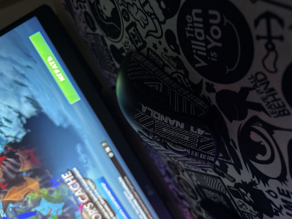 This image depicts an indoor computer setup within the city of Hrodna, Belarus. The focal point is a black gaming mouse, customized with white patterned grip tape on its sides, positioned on a detailed black and white graphic mouse pad. The grip tape on the left side of the mouse prominently displays the word "NANDLA." The mouse pad features various monochrome designs, including a circular motif with the text "The Villain is You" and a smiley face, the phrase "LEAVE IT ALL BEHIND" below a silhouetted figure, a stylized eye, an anchor symbol, and other abstract patterns. In the background, a computer monitor is visible at an upward angle, displaying a video game interface (identified as Dota 2 due to the context of "OR'S CACHE" and the "ИГРАТЬ" button). The screen shows partial text "OR'S CACHE" and a bright green rectangular button with the Cyrillic word "ИГРАТЬ," which translates to "PLAY." The game's graphical background features a stylized blue and white landscape, possibly depicting mountains or ice. The scene is dimly lit, with the primary illumination source appearing to be the monitor itself. No individuals are present in the image.