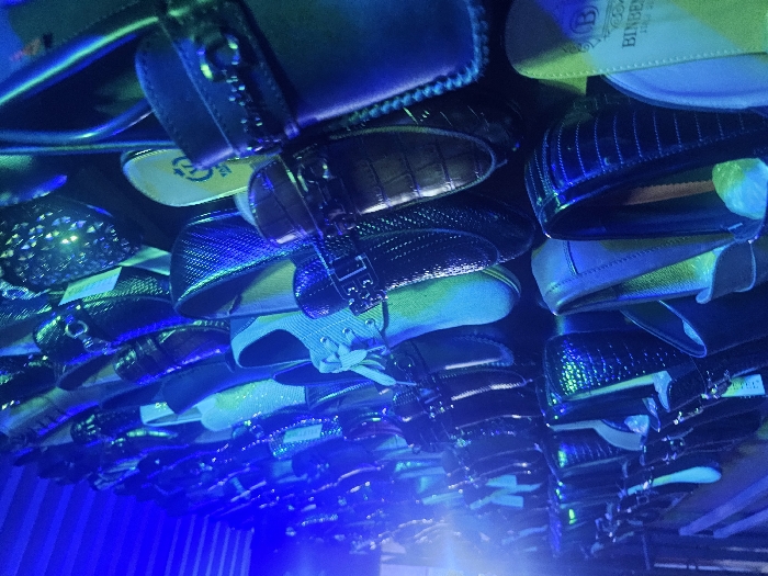A dense array of assorted shoes hangs upside down, possibly from a ceiling. The shoes vary in style, some with buckles and straps, others with textured surfaces. Lighting casts a blue and green hue, creating an ethereal and somewhat surreal atmosphere. The angle is low, looking upwards into the chaotic arrangement. One shoe reveals the brand "BINBEREN" printed on its sole.