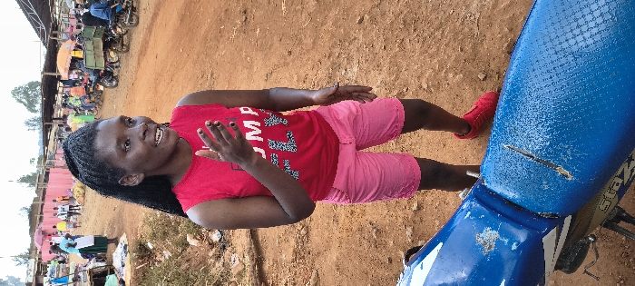 An outdoor scene depicts a dark-skinned female, approximately young adult, standing in the foreground, angled slightly to the viewer's right