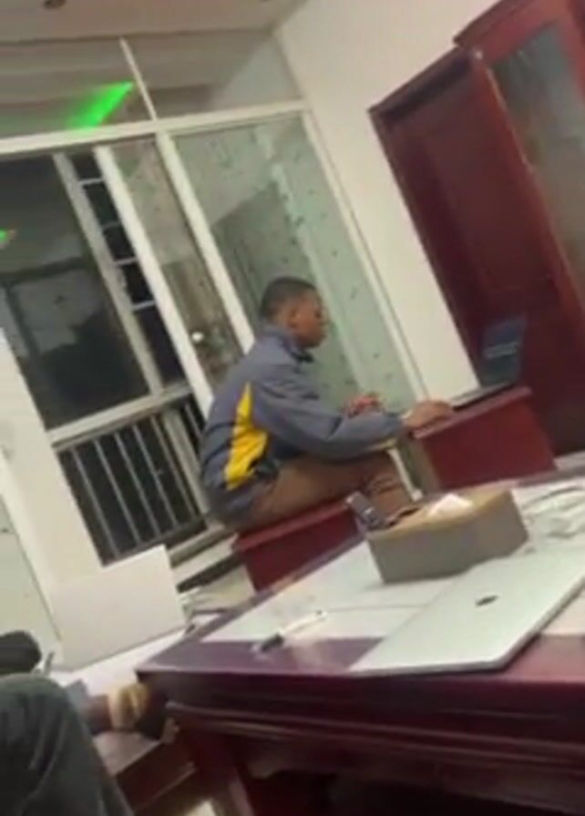 room in what appears to be a house or apartment. There are several people in the room. One man is sitting at a desk with multiple computer screens and a laptop, working on the computer. Several other people are sitting on a couch facing the desk. Some are looking at their phones, and at least one is taking notes in a notebook. There is a large coffee table in the center of the room with various items on it, including a laptop, a tissue box, and some glasses. There is a large window behind the couch, and an air conditioning unit is visible next to it. The lighting in the room is a combination of natural light and artificial light, with some colored lights adding to the ambience. The overall impression is that of a group of people engaged in some kind of work or study session in a casual and relaxed environment.