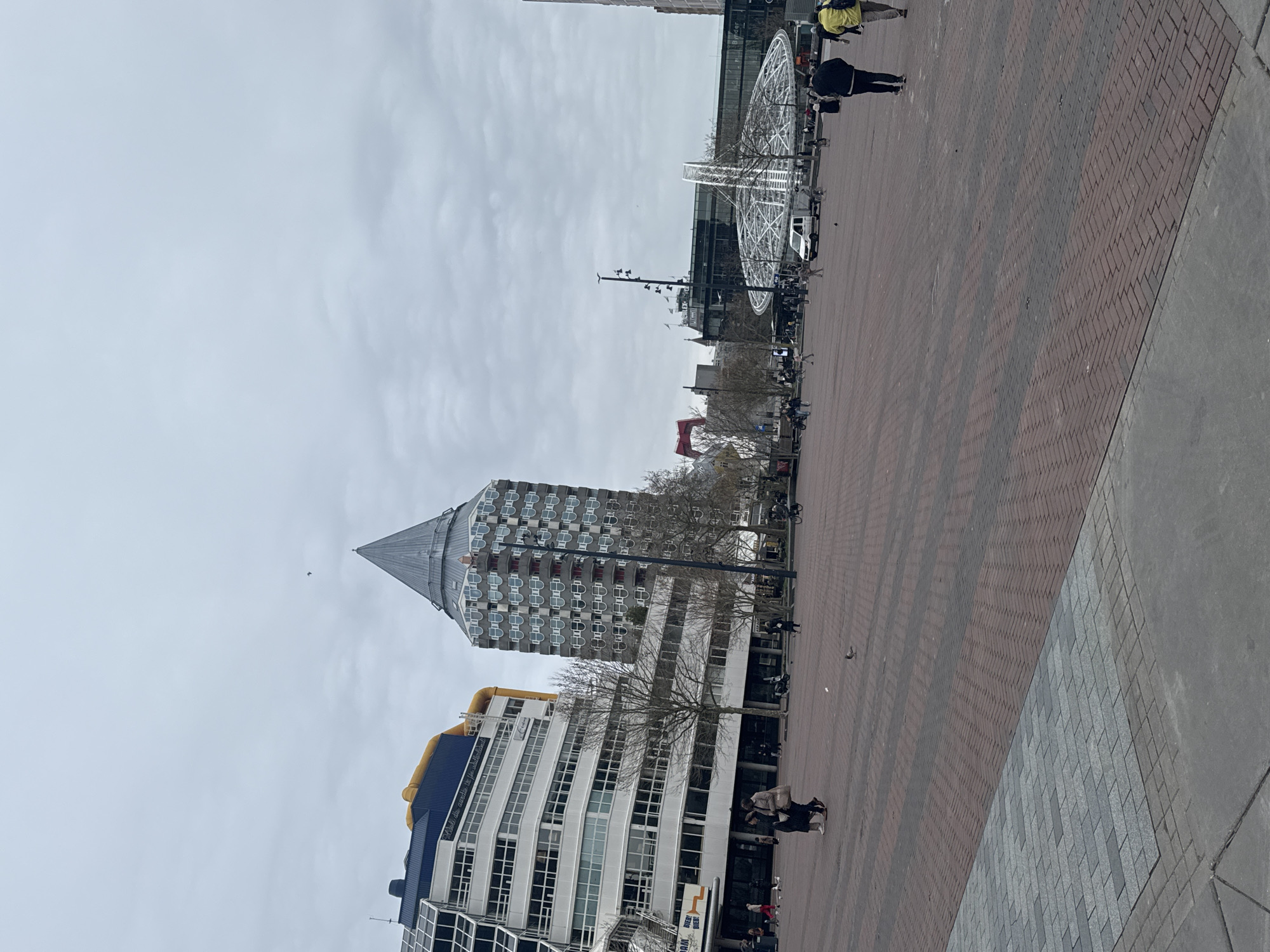 The image depicts the Binnenrotte square in central Rotterdam, Netherlands, under an overcast grey sky