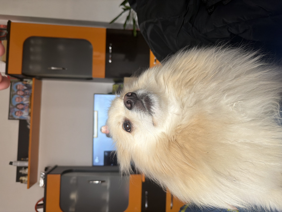 Indoor residential setting in the city of Unknown, Unknown. A cream-colored Pomeranian dog occupies the majority of the foreground, facing slightly right and looking directly upwards. The dog has dark eyes and a black nose. A light-skinned human hand is visible at the top of the frame, extending downwards towards the dog. In the background, a flat-screen television displays a male figure. Two tall, narrow cabinet units with an orange-brown and dark grey/black finish flank the television. An orange-brown wall shelf above the television holds a framed picture displaying four cartoonish human faces, alongside other small decorative items. A dark, possibly black, padded jacket or similar garment is partially visible on the right side, adjacent to the dog.