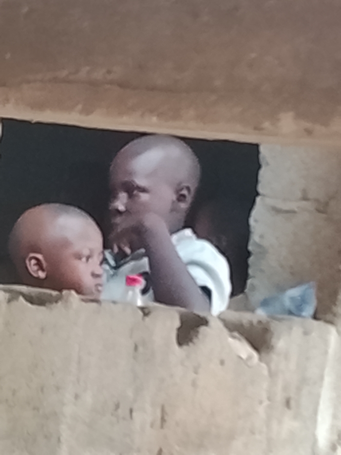 The image depicts two young individuals, likely children, observed from outside a structure in Akwanga, Nigeria